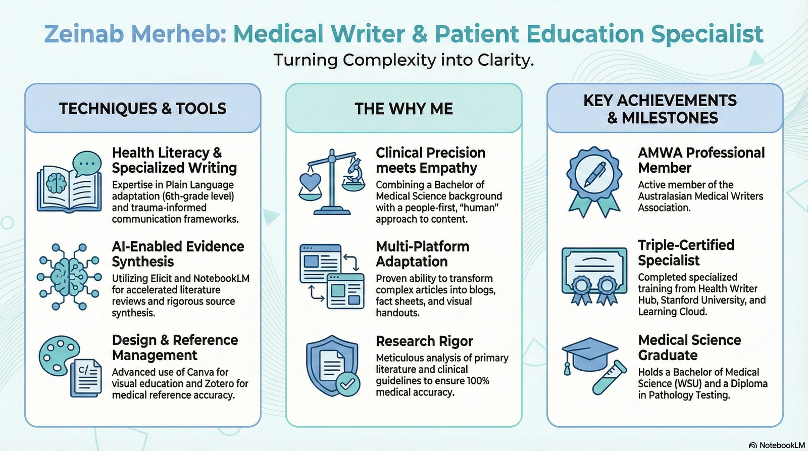 • Health Literacy Advocacy: Creating content that empowers patients to navigate the healthcare system.